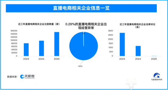 天眼查天眼风险显示,从事直播电商相关业务的企业中,0.78%的相关企业曾出现法律诉讼,0.29%的相关企业曾出现经营异常,0.32%的相关企业曾出现行政处罚。据天眼查深度风险数据显示,100余家直播电商相关企业现存被执行人信息,占比0.02%。