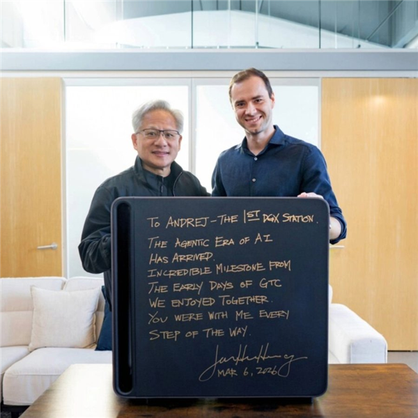 快科技3月19日消息,日前的GTC大会上,NVIDIA又推出了AI超算工作站DGX Station GB300升级版,而第一台产品就被黄仁勋送给了AI大神Andrej Karpathy。