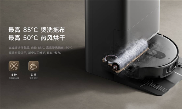 拥有35000Pa超大吸力,支持16孔出水实时自清洁、仿人手加压拖地,搭配主刷割毛发+边刷防缠的双重毛发防缠绕设计。