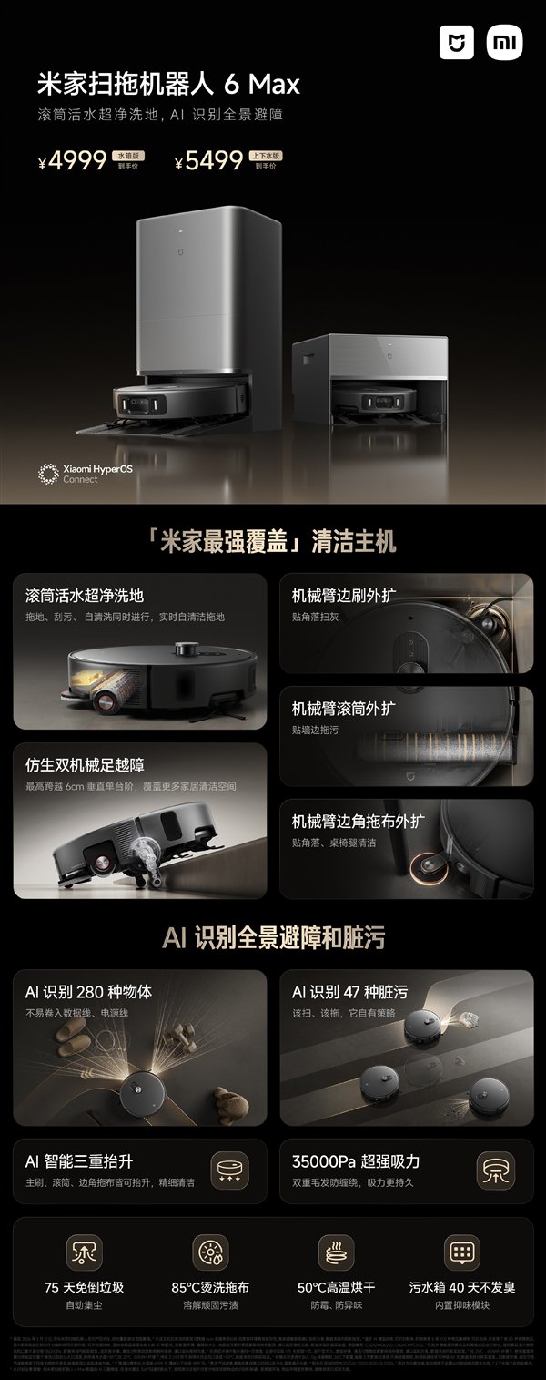 快科技3月19日消息,米家扫拖机器人6 Max今天正式开售,这是目前小米最强机型,到手价4999元起,提供水箱版、薄嵌上下水版两个版本选择。