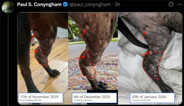 2025 年 12 月,罗茜接受了第一针注射。一个月后,效果惊人——它的主要肿瘤显著缩小。那只曾经奄奄一息的狗,又开始活蹦乱跳地追兔子了。