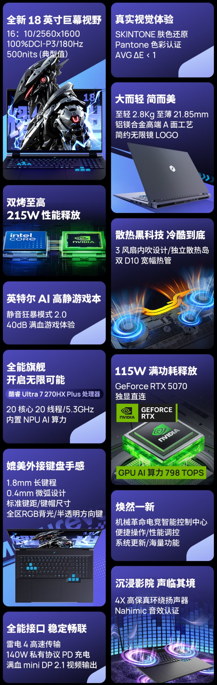 核心硬件配置上,耀世18 Pro带来两款差异化配置版本,覆盖不同预算用户的需求。其中高配版首发搭载Intel Ultra 7 270HX Plus处理器,基于Arrow Lake Refresh架构设计,支持全新英特尔二进制优化技术,配备8个P核+12个E核,共计20核心20线程,P核基础频率2.4GHz、最高睿频5.3GHz,E核基础频率1.8GHz、最高睿频4.7GHz,配备36MB L2缓存,处理器基础功耗55W,最大睿频功耗可达160W,内置核显最大动态频率1.9GHz;搭配移动端RTX 5070显卡,支持DLSS 4技术,可提供798 TOPS的AI算力。另一款入门版本则搭载i7-14650HX处理器,搭配RTX 5060移动端显卡,满足主流游戏与日常创作需求。