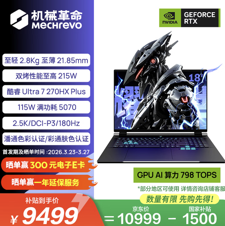 3月18日,机械革命举办了新品发布会,推出耀世18 Pro大屏游戏本。作为首批搭载英特尔酷睿Ultra 200HX Plus系列处理器的机型,该机聚焦大屏沉浸式体验与满血性能释放,双配置版本现已同步开启预约,酷睿i7-14650HX+RTX 5060版本首发指导价9299元,国补后到手价7904.15元;酷睿Ultra 7 270HX Plus+RTX 5070版本首发指导价10999元,国补后到手价9499元。目前两款配置均已在京东平台开启预约,将于3月23日正式开售。首发期间参与晒单活动,即可有机会赢取300元京东E卡与一年延保服务。