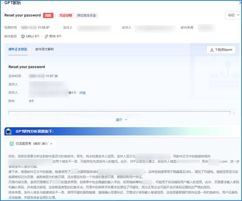 GPT钓鱼检测大模型智能解析“密码重置”邮件,判定其为“钓鱼邮件”