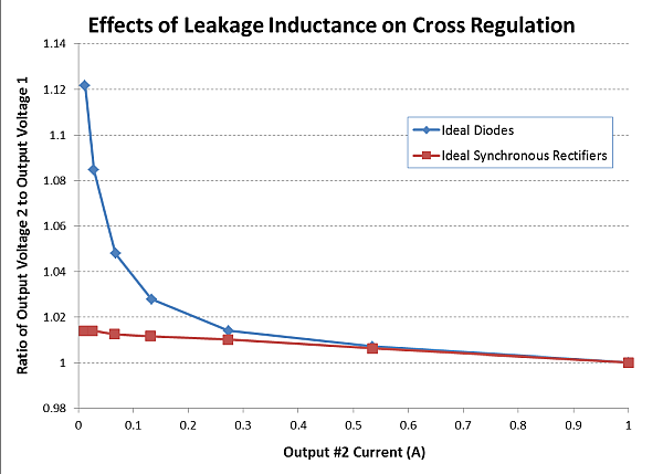 请记住,您只需关注漏感的影响,因为这些仿真使用了理想二极管和理想同步整流器。若考虑电阻性损耗与整流器正向压降,同步整流器的优势将进一步放大,如电源设计小贴士 72 中所述。