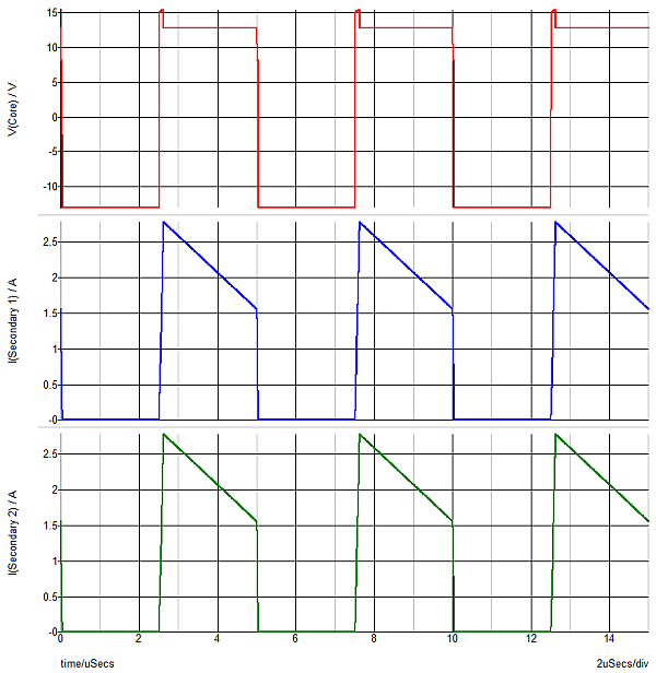 现在考虑当向变压器的两个次级绕组引入 100nH 漏感,初级绕组串联 3μH 漏感时,会发生什么。这些电感模拟了电流路径中的寄生电感,包括变压器内部的漏感及 PCB 与其他元件中的电感。当初级场效应晶体管 (FET) 关断时,初级漏感仍有电流流动,次级漏感以 0A 的初始条件开启 1-D 周期。变压器磁芯上出现所有绕组共有的基座电压。此基座电压可使初级泄漏电流斜降至 0A,并使次级泄漏电流斜升,从而向负载提供电流。