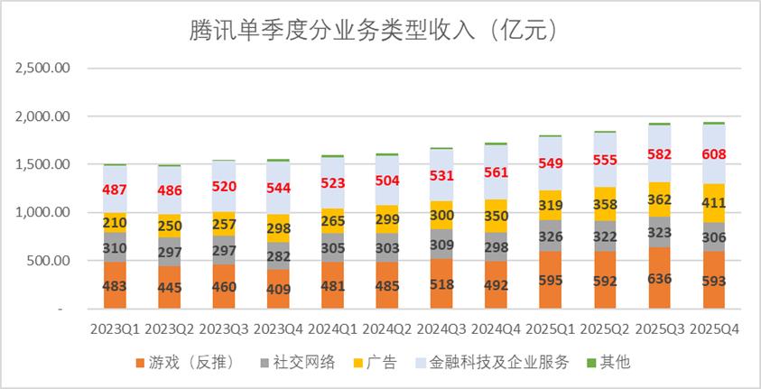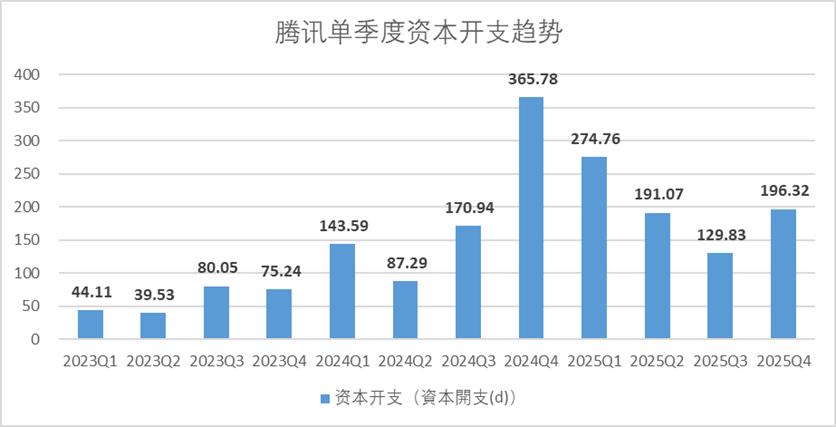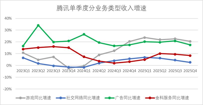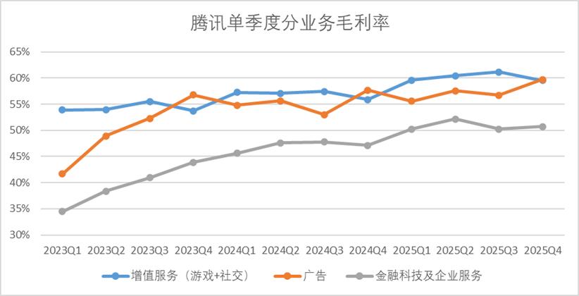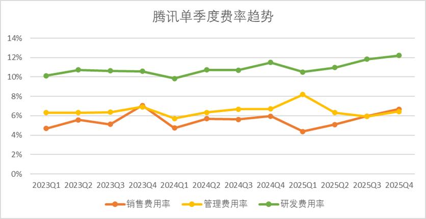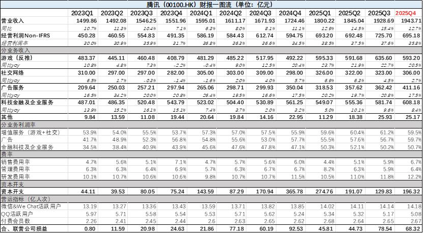 3月17日尾盘,腾讯发布了2025年四季度财报,营业收入录得1943.7亿元,同比增长12.7%,略高于市场一致性预期,净利润为582.6亿元,同比增长14%,经营利润率35.8%,与预期基本一致。(下图为腾讯一图流,数据均来自于财报,单位亿元,锦缎研究院整理)腾讯的主要业务分为三个模块:增值服务(即售卖数字化商品)、广告和金融科技及企业服务。其中有五个核心的营收贡献业务,增值服务中游戏占2/3,是目前腾讯营收的第一业务,其余是社交网络,比如视频号、内容平台的会员和小程序等等。营销服务是腾讯第三大业务,主要就是广告收入;金融科技及企业服务包含较多,营收贡献分为两部分:支付、财付通等互联网金融产品,以及腾讯云业务。除此之外,作为港股龙头企业、中概互联最核心的标的,腾讯在前沿科技尤其是AI领域的动向也值得我们关注。坦诚讲现如今财报的信息较市场反应而言相对滞后,AI的发展早已不是按月去计量变化,因此我们也将结合资本开支动向和电话会表述,来介绍下腾讯最新的AI战略有何变化。三季度整体的业务表现总结而言:·游戏业务的基本盘非常稳定,长青游戏还有价值可挖,去年爆火的几款游戏持续了高光表现,短期内不会出现太大的波动。·视频号商业化节奏还是慢,内容矩阵受的冲击较大,但云业务的红利期刚刚开始。·费率明显提升,资本开支增长明显,折旧也在加速,股票的回购预期降温,种种迹象表明腾讯的AI动作正在提速,结合管理层近期的表述来看,All in AI就是腾讯2026年的唯一主线。具体业绩分析如下:1、游戏业务增速放缓,基本盘稳固,但缺少新游预期2025年第四季度,腾讯游戏业务营收(增值服务反推)593亿元,同比增长20.5%,与2024年同期增速基本持平,但是相较于前三季度增速略低,并且环比下降了6.8%。当然,这也比较符合市场预期,毕竟腾讯历年四季度游戏业务营收都低于三季度。从细分市场来看,本土游戏市场收入达到382亿元,同比增速15%,海外游戏市场收入211亿元,同比增长32%,海外游戏市场的增速远高于国内市场。从财报披露的产品侧来看,四季度无论是国内还是海外,基本上都是长青游戏持续发力贡献,国内依靠去年大火的《三角洲行动》以及《无畏契约》手游、《鸣嘲》变现带来增量;海外还是依靠Supercall旗下游戏和《Pubg Mobile》。从游戏内容来看,四季度腾讯并没有特别出圈的新游,不过《三角洲行动》、《无畏契约》手游、《鸣嘲》三大新长青游戏还有很强的开发潜力,根据Questmobile的数据显示,2025年12月,移动端月活规模增速最快的正是《三角洲行动》,月活同比增速达到了225%,同时《三角洲行动》也成为继开心消消乐和王者荣耀后,第三款月活突破1500万的手游,潜力巨大。虽然目前腾讯的战略重点肯定是AI,但是相较于其他互联网企业,腾讯的游戏业务具备得天独厚的优势——几乎是市场中无可撼动最强的现金奶牛。结合电话会中James Michelle的表述来看,腾讯内部对游戏行业的认知非常强,腾讯理解AI时代游戏供给侧放量的变化,有成熟的长期运营经营,也有渠道优势,短期内基本盘优势不会改变。当然,鸡蛋里面挑骨头,表现优异的游戏中,除了端转手的无畏契约,基本都是2025年以前的游戏,目前还未看到下一款有望成为长青游戏的腾讯新游。2、视频号商业化进度还是较慢、金科企服的表现符合预期增值服务业务板块的另外一面,就是涵盖视频号和内容平台会员的社交网络业务,2025年四季度腾讯社交网络业务收入306亿元,同比增速仅有2.7%,连续三个季度增速下滑,显然这与年初市场对今年视频号商业化提速的预期不符。目前社交网络是腾讯四个核心成熟业务中,增速最低的业务,笔者个人感觉,腾讯内部对视频号的定位可能还在犹豫,没有过度提升广告加载率,还是寄希望于视频号自然流量能够更高,去夯实微信社交的地位。毕竟拥有最大用户基数的微信一定是AI应用生长最好的土壤。金科企服方面,四季度录得营收608亿,增速环比下滑,但同比增速依然有8.4%,也是腾讯四个主要业务中,唯一一个环比三季度取得正增长的业务。当然金融科技相对平稳,最核心的还是云业务,企业服务同比增速达到了22%。对于目前的AI发展而言,云基础设施的红利期还远远没有结束,今年一季度Openclaw的爆火,可能会进一步拉动云业务的表现。3、营销业务低增速高毛利,AI有用但不明显第四季度,腾讯营销服务业务营收录得411亿元,同比增速达到了17.5%,虽然略低于预期,但营销服务整体看过去一年内的增速表现不错,在腾讯内部仅次于游戏业务。并且,腾讯四季度广告层面的效率表现不俗,营销业务的实际利润率接近60%,反超了增值服务业务。不同于美国消费市场的繁荣,中国广告市场的实际增速并不算高,而腾讯营销业务低增速,高毛利,似乎也向投资者证实了两个事:·其一,视频号虽然商业化进度较慢,但是基本盘较深,用户量基数还是很大的,腾讯业绩会透露视频号是目前中国第二大短视频服务平台,未来潜在的上限还是不错。·其二,AI确实对目前的广告投放效率有明显的正面作用,但考虑到视频号实际增速(2025年全年播放时长增长20%),效果还不算特别明显。4、费率提升明显,三费水平均环比提升四季度腾讯收入侧没有明显预期外的变化,但是成本侧变化不算小,首先就是整体的费率出现了明显的抬头,环比销售费率增长了70bp,管理费率增长了50bp,研发费率增长了40bp。销
