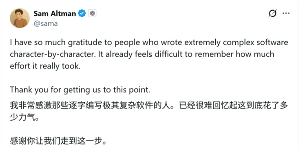 OpenAI的AI模型(如ChatGPT系列)正是通过训练海量由人类程序员手动编写的代码才得以诞生,而这些训练数据的来源——GitHub、Stack Overflow等公开代码库——的创作者,正是奥尔特曼现在所感谢的群体。
