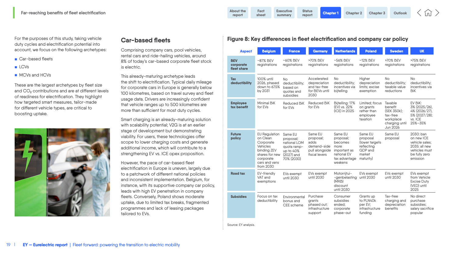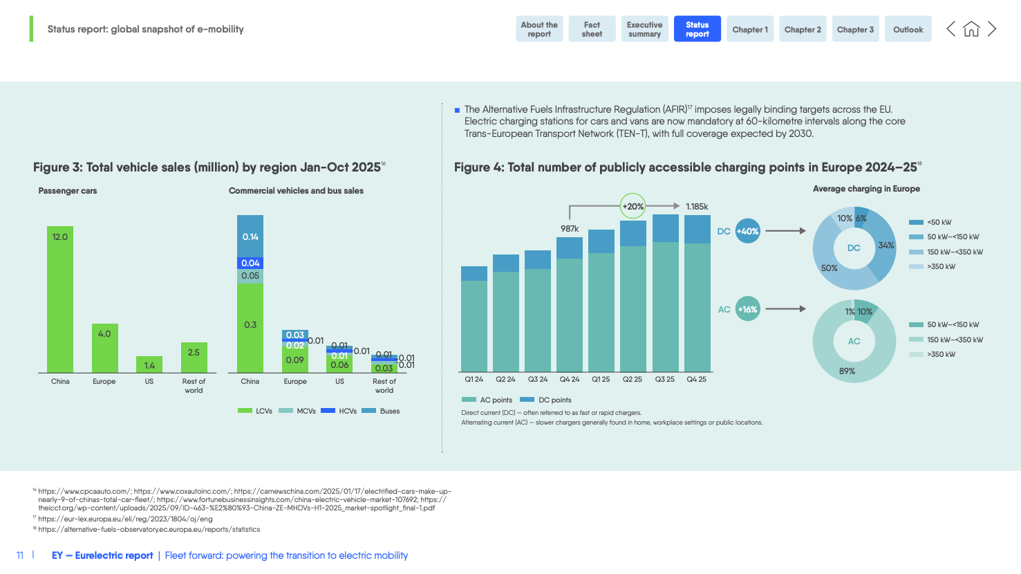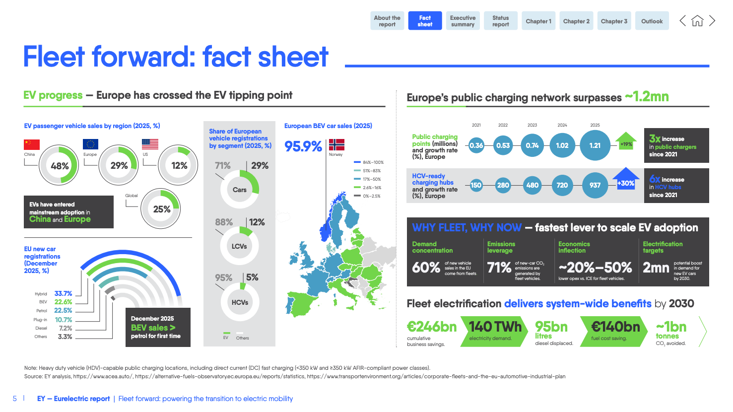 欧洲交通体系正进入结构性转折点。根据报告,企业车队贡献约60%的新车销量,并覆盖几乎全部商用车市场,同时占道路交通碳排放的重要份额,其中乘用车约45%、轻型商用车约12%、卡车和公交约27%。