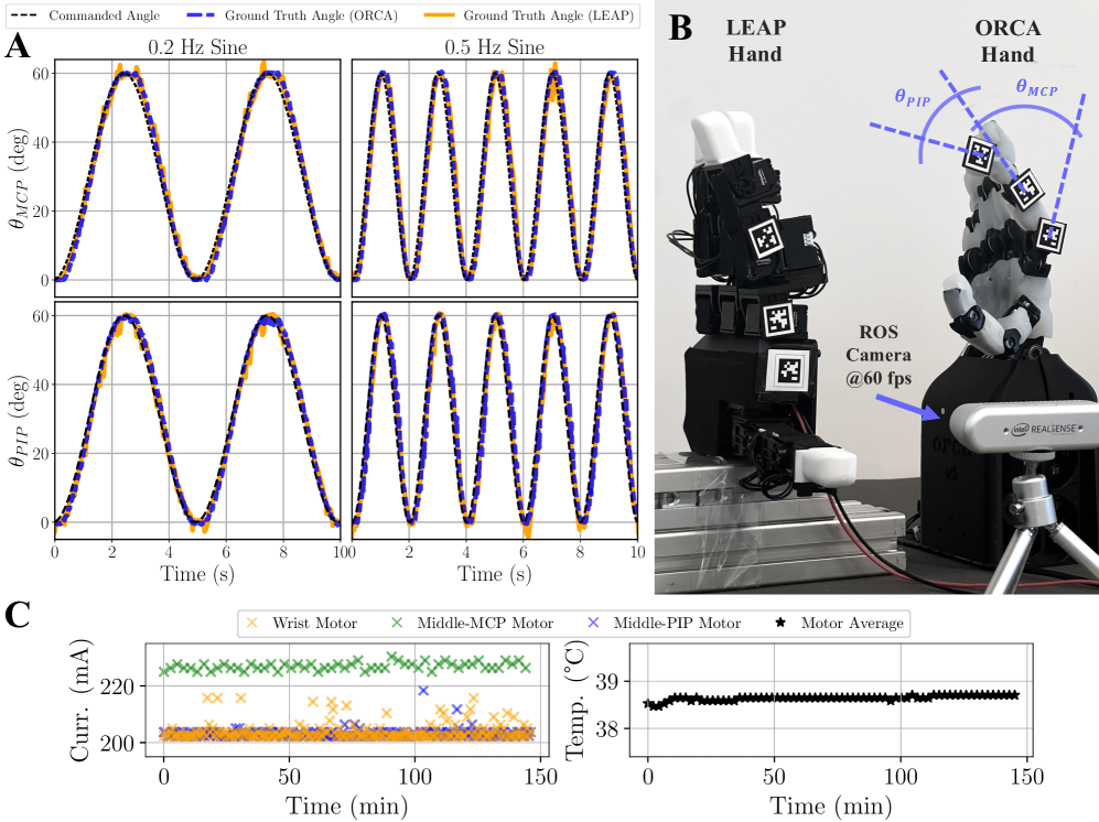 图丨 (A) 0.2 Hz 和 0.5 Hz 下的关节响应对比:尽管采用腱驱动设计,ORCA 仍实现了与 LEAP 手相当的精度和延迟。(B) 精度基准测试设置:使用 AprilTags 推断与指令同步的真实关节角度。(C) 可靠性测试:连续 2.5 小时的抓取(2,200 次以上循环)和手腕运动(550 次以上循环),无故障、过热或性能下降,稳定的电机电流和温度证明了这一点。(来源:arXiv)