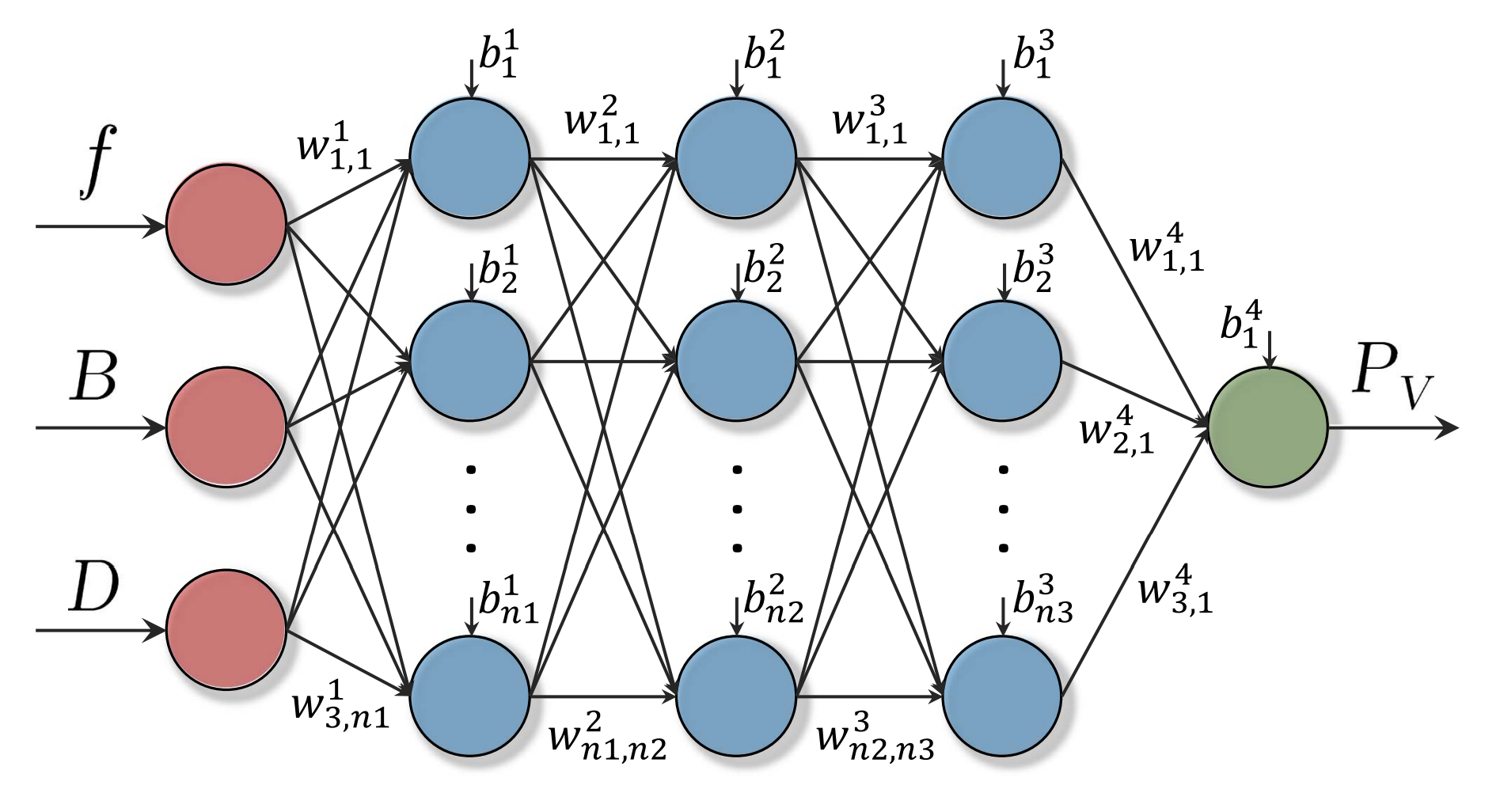 对于图 2 这类前馈神经网络,隐藏层(蓝色)的结构与神经元数量可进一步优化;输入参数也可扩展至温度、直流偏置等因素。模型规模、复杂度与精度之间需要权衡。