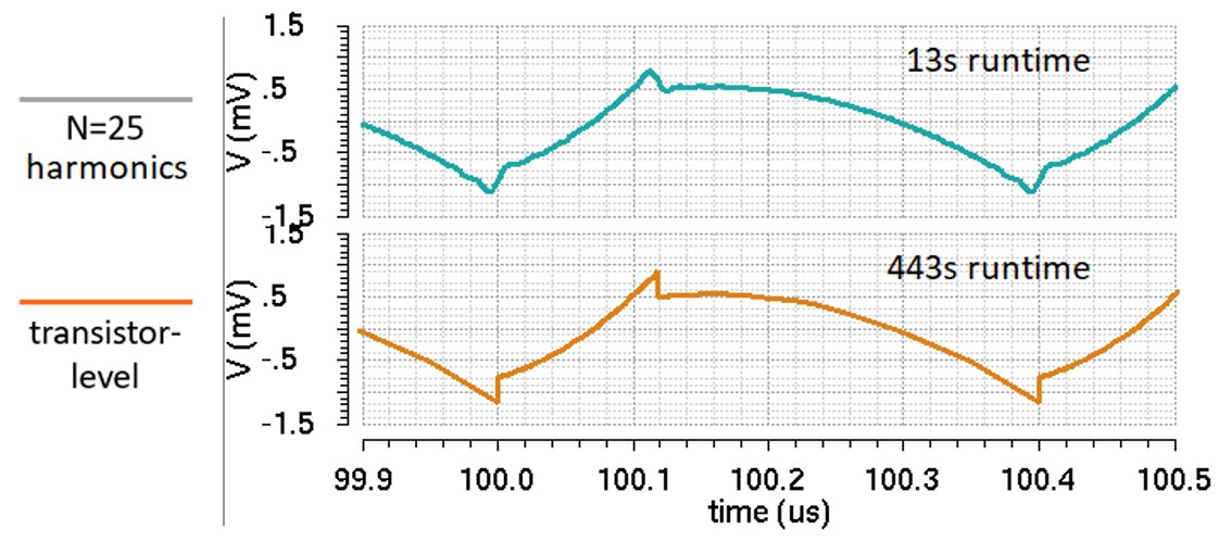 采用包含 25 次谐波的重构方法,可近乎完美地复现由寄生参数引起的非线性纹波形态,精度接近晶体管级全仿真。更关键的是,该方法速度提升 35 倍(13 秒 vs 443 秒),精度损失仅 1.3%。