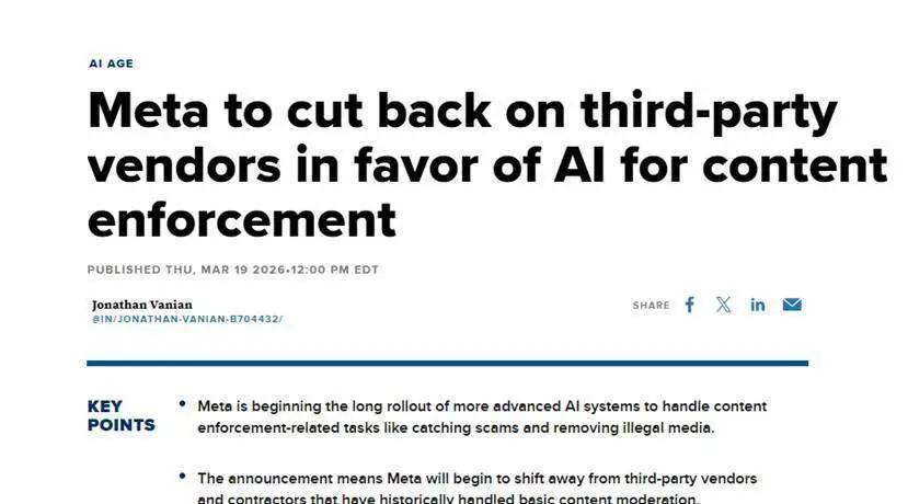 3月19日,meta在官网宣布将在内容审核方面引入更先进的人工智能系统,用于识别诈骗信息和删除非法内容。此举可能帮助公司削减对外包供应商和合同工的使用,标志着这家社交媒体巨头正利用其在AI领域的巨额投入来精简运营。