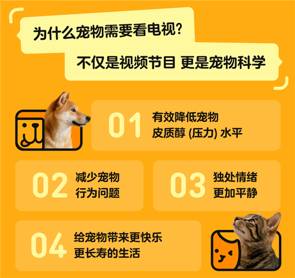 宠物独处易产生压力,进而出现乱叫、啃咬、拆家等状况,长期还会影响健康。宠物TV基于宠物视听特点科学设计,可帮助降低压力水平,让宠物情绪更稳定,居家环境更安心。