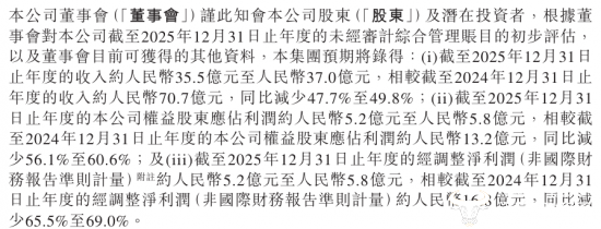 但其个人的庞大流量却似乎没有转化为公司的业绩。珍酒李渡发布的盈利预警显示,集团2025年度预期收入约35.5亿至37.0亿元,相较于2024年70.7亿元的收入同比减少47.7%至49.8%,公司权益股东应占利润约5.2亿至5.8亿元,较同期13.2亿元同比下降56.1%至60.6%。