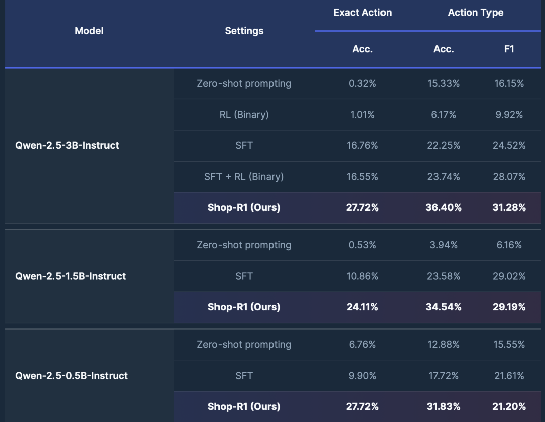 如表格所示,直接使用 zero-shot 提示几乎无法完成该任务,Qwen-2.5-3B-Instruct 的 exact-action 准确率仅 0.32%,说明长序列网页行为无法仅靠通用指令能力恢复。仅使用 稀疏二值奖励的强化学习同样效果有限,从零训练仅达到 1.01% exact-match 和 6.17% type accuracy。
