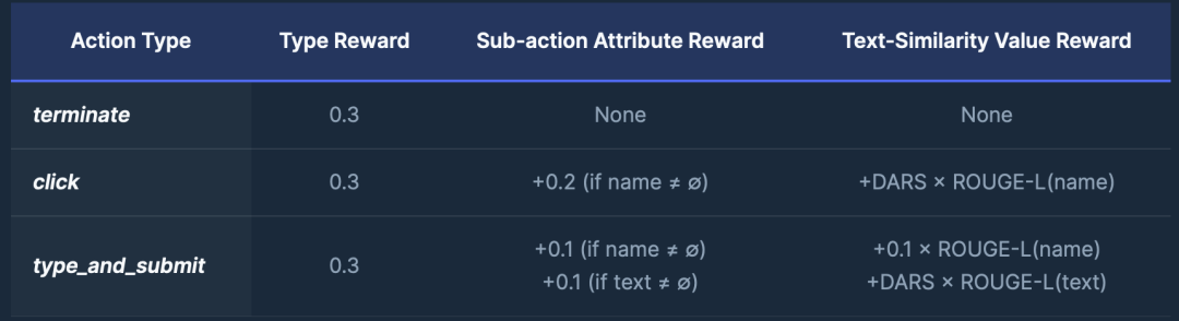 对于文本型子动作(例如按钮标签或搜索查询),当其与真实答案之间的 ROUGE-L 相似度超过预设阈值(例如 0.75)时,将根据相似度大小给予相应的软奖励(soft reward)。