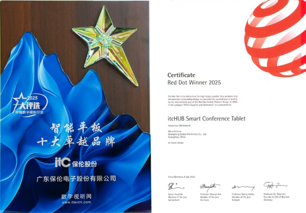 轻量协同,智慧无界。正是凭借在技术创新、用户体验与安全可靠等方面的全维度突破,itc智慧会议平板先后成功获评“2025年智能平板十大卓越品牌”、“德国2025红点产品设计大奖”等行业奖项,赢得了行业与设计界的双重权威认可。