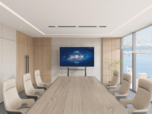 在场景适配上,系统外观采用简洁商务风设计,整体采用全铝合金材质搭配极光紫的配色,超窄边款,设计屏占比高达90%,86mm超薄屏体,隐藏式端口,造型简约大气。可壁挂安装,也可以灵活地放置在移动支架上,满足政务、金融、集团企业、教育培训等不同场景的高端会议需求。
