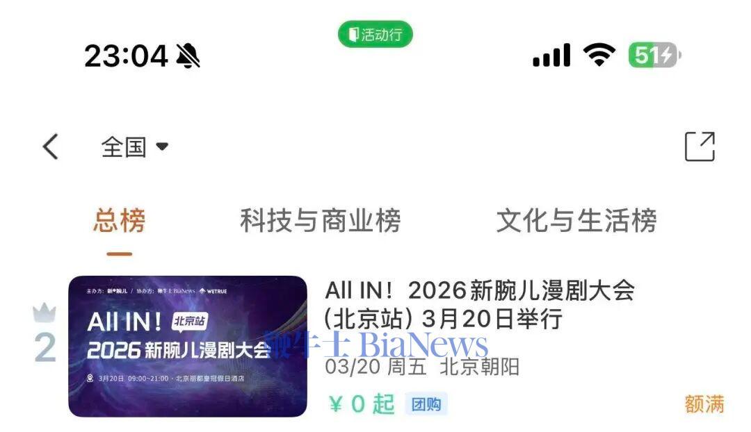 活动行全国总榜排名第二。