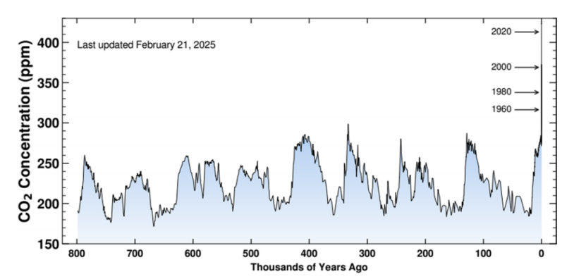 图丨大气二氧化碳浓度变化(单位:ppm),数据来源包括南极冰层中捕获的空气测量结果(Luthi 等,2008; Rubino 等,2019)以及莫纳罗亚天文台自 1958 年至今的直接观测数据(Keeling 等,2005)(来源:Air Quality,Atmosphere & Health)