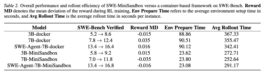 实验结果显示 SWE-MiniSandbox 框架的训练质量(SWE-bench Verified)和传统 Docker 框架几乎一致,同时在环境准备时间上仅仅是 Docker 的 25% ,显著减少了 rollout 的平均时间开销。