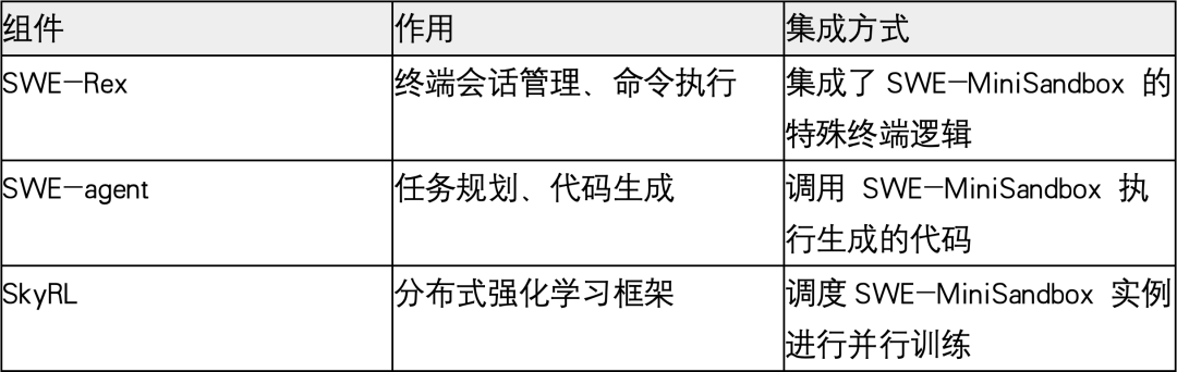 通过直接与现有核心 SWE 工具集成 ——SWE-Rex(终端管理)、SWE-agent(任务求解)和 SkyRL(可扩展的多节点 RL),SWE-MiniSandbox 成为了 SWE Agent 任务中容器后端的一个无缝、即插即用的替代品。