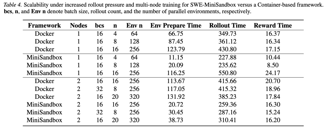 通过拆解强化学习 rollout 的时间代价并对各部分进行可视化分析,发现 SWE-MiniSandbox 在环境准备时间(蓝色)上明显短于 Docker 环境。
