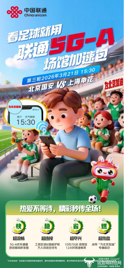 3月21日,北京工人体育场热血涌动、人声鼎沸,万众期待的中超联赛“京沪大战”在此激情上演——北京国安队坐镇主场迎战上海申花队。作为首都主导通信运营商、中超联赛官方赞助商,中国联通坚决贯彻落实“网络强国”“数字中国”“体育强国”国家战略,以高度的政治自觉与央企担当,依托领先的5G-A技术在赛场内外构建起全方位、立体化的智慧网络运营体系,以“高稳定、超高速、全场景”优质网络为现场数万名球迷带来极致畅快的观赛体验。