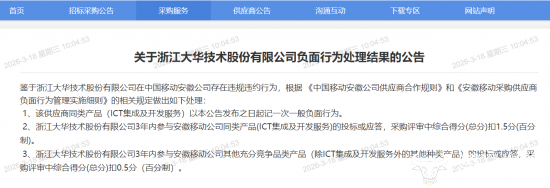 2026年1月4日,中国移动采购与招标网发布《关于浙江大华技术股份有限公司负面行为处理结果的公告》。