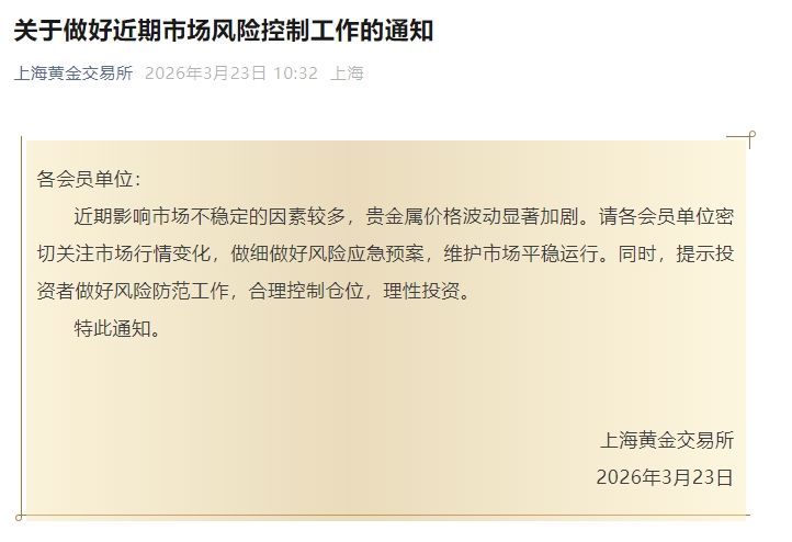 新京报讯 3月23日,上海黄金交易所发布关于做好近期市场风险控制工作的通知。