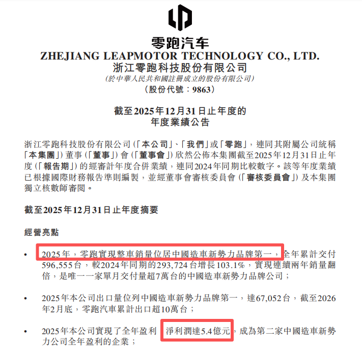 具体来看,蔚来、小鹏均在 2025年第四季度实现首次季度盈利;零跑在2025年实现首次年度盈利,理想则在2025年实现连续第二年年度盈利。
