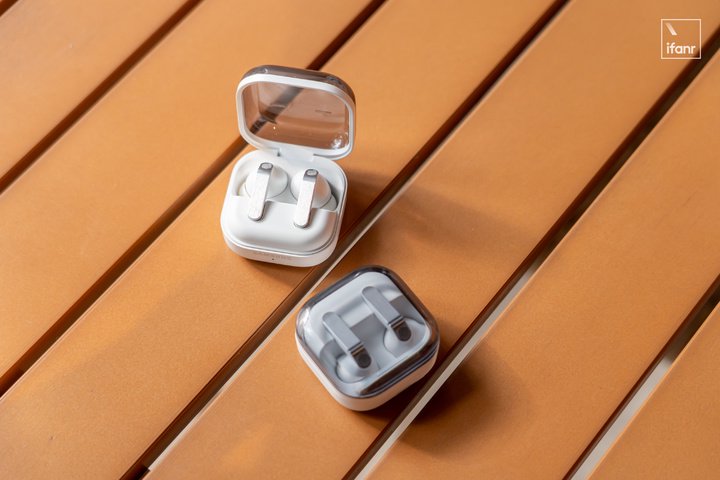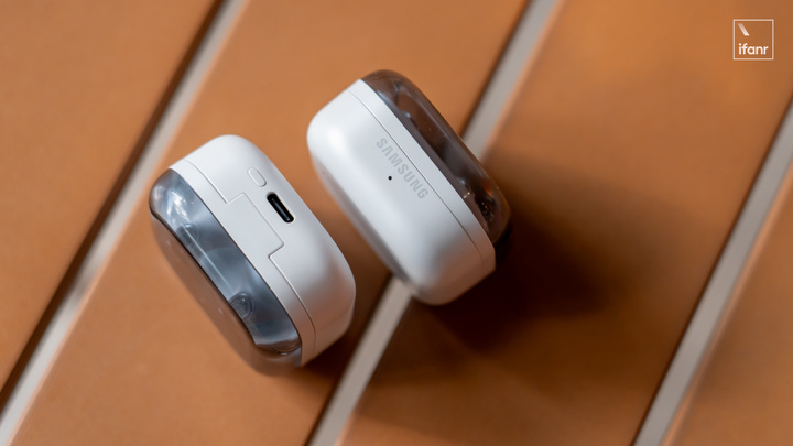 耳机的 USB-C 充电口和启动配对模式的物理按键放在充电盒后侧,正面只保留了三星 Logo 和展示使用、充电状态的指示灯。