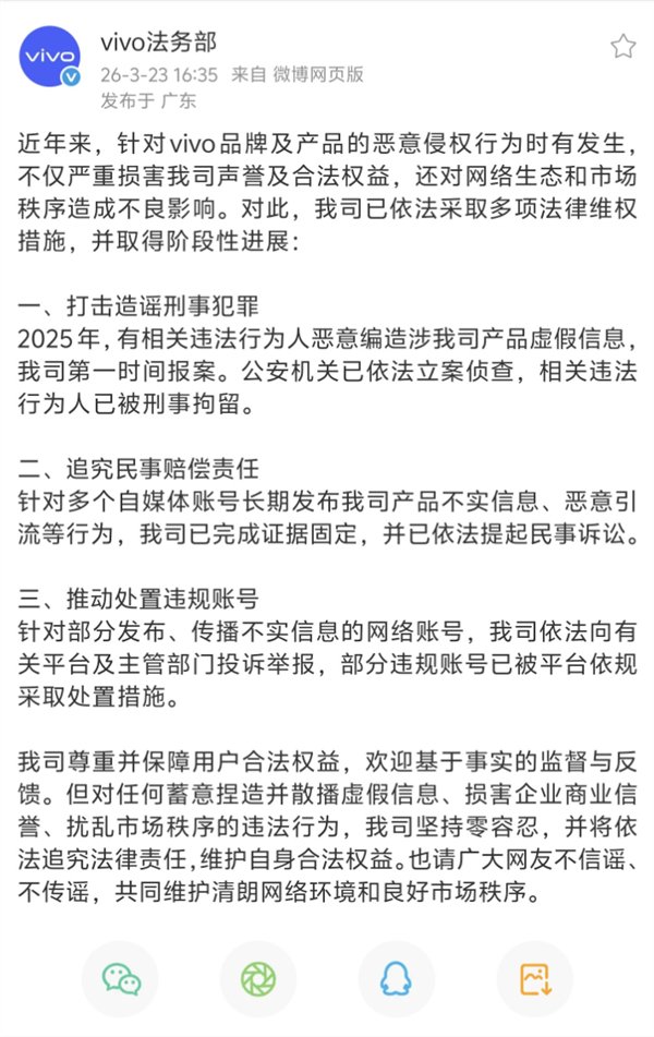 vivo法务部强调,我司尊重并保障用户合法权益,欢迎基于事实的监督与反馈。但对任何蓄意捏造并散播虚假信息、损害企业商业信誉、扰乱市场秩序的违法行为,我司坚持零容忍,并将依法追究法律责任,维护自身合法权益。也请广大网友不信谣、不传谣,共同维护清朗网络环境和良好市场秩序。