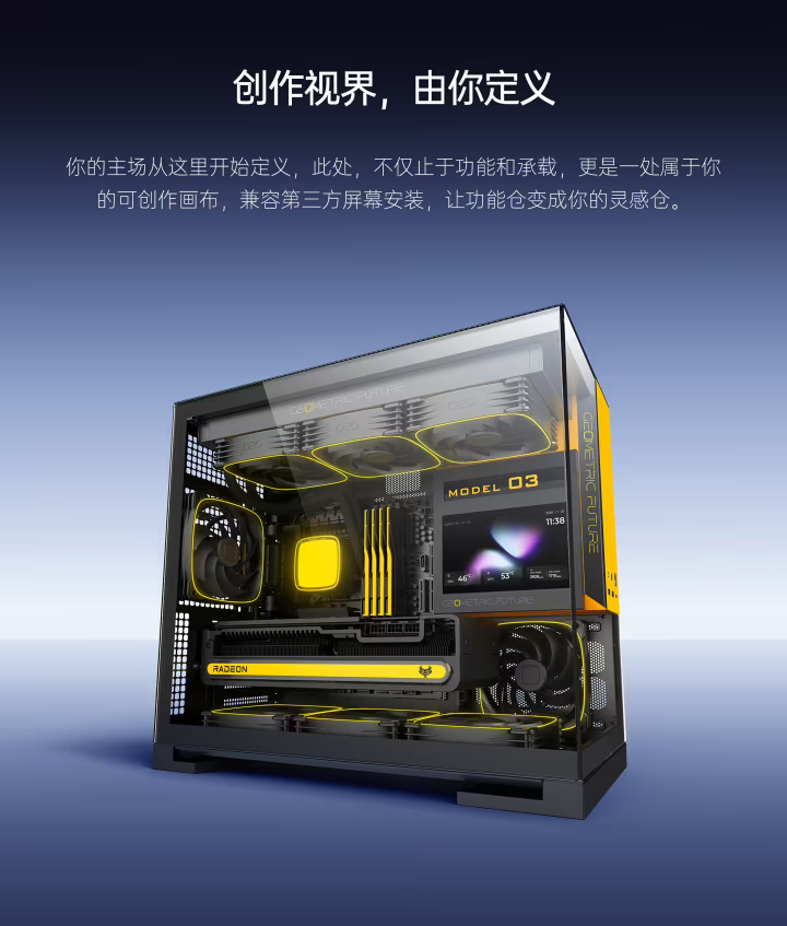 在空间布局上,几何未来Model 3采用前上置电源仓布局,同时将前置I/O面板集成于电源仓区域,大幅优化了机箱内部的空间利用率,完美适配M-ATX规格主板,能满足主流中高端的装机需求。