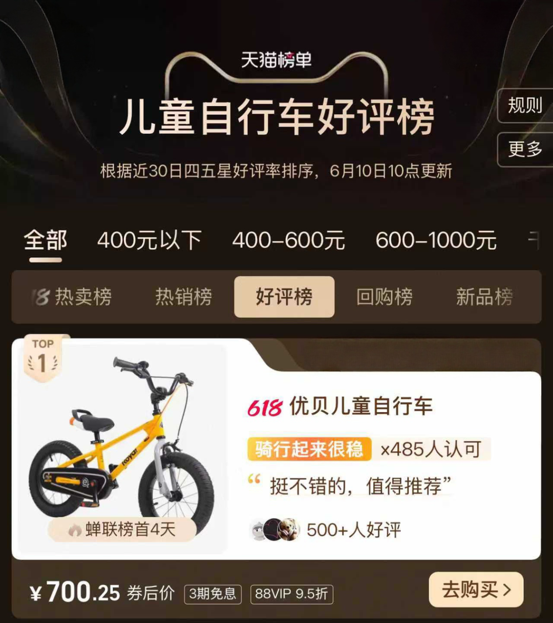 优贝登顶天猫儿童自行车年度畅销榜及好评榜