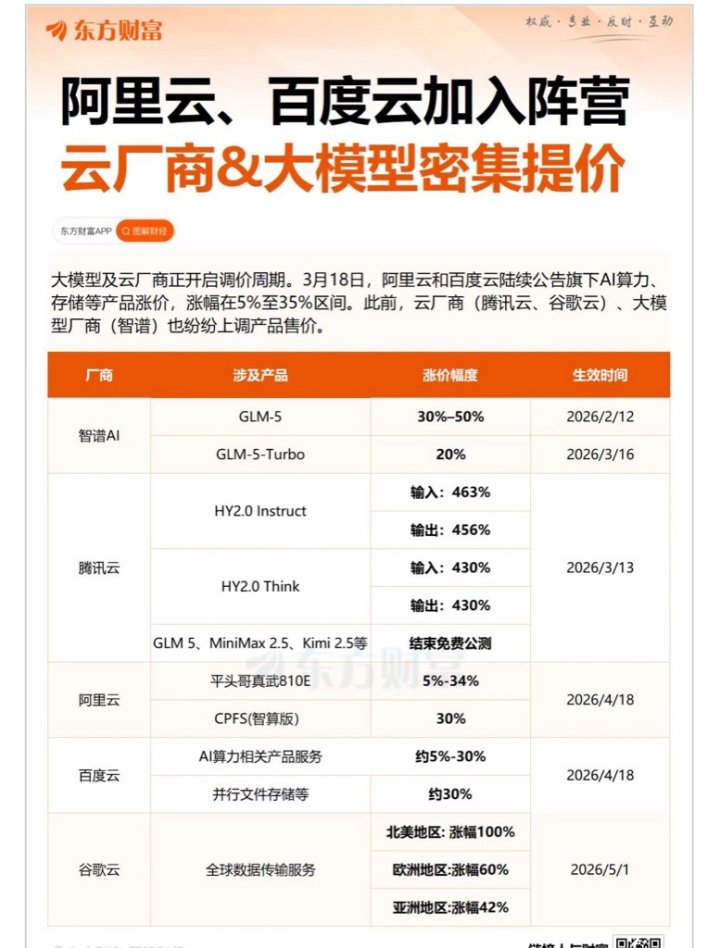 短短几天后,3月18日,阿里云、百度智能云先后官宣上调AI算力相关产品价格,均定于4月18日正式生效,调价范围高度聚焦AI算力与存储服务。其中,阿里云针对自有算力卡及智算版存储产品分别上调5%-34%、30%;百度智能云则对AI算力相关服务及并行文件存储同步提价,涨幅在5%至30%之间,均指向AI需求爆发带来的成本压力。