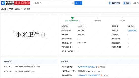 据查询企查查APP发现,今年9月,已有成都一包装有限公司申请注册一枚“小米卫生巾”商标,国际分类为医药,商标状态为注册申请中。(罗宁)