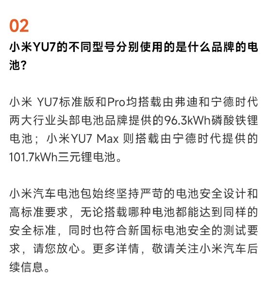 小米汽车表示,“小米 YU7标准版和Pro均搭载由弗迪和宁德时代提供的96.3kWh磷酸铁锂电池;小米YU7 Max 则搭载由宁德时代提供的101.7kWh三元锂电池。”