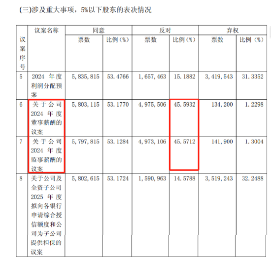 业绩上不去,高管薪酬却下不来。对此,一众股东也是尤为不满。2024年度股东大会上,在《关于公司2024年度董事薪酬的议案》和《关于公司2024年度监事薪酬的议案》投票中,金种子酒5%以下股东分别投下反对票有497.55万票和497.31万票,占比为45.59%、45.57%。