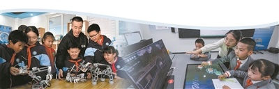 (左)在山东省日照市新营小学,学生在操作编程机器人。新华社记者 郭绪雷摄 (右)浙江诸暨市明德小学的学生在AR虚拟现实科普实验室上科学课程。新华社记者 徐昱摄