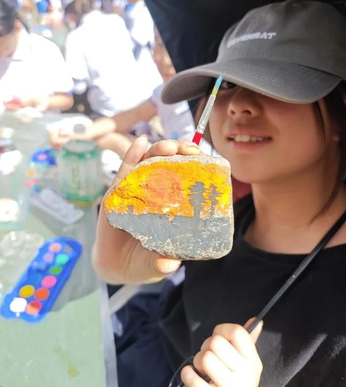 溪水潺潺,阳光透过树影洒落在河滩上,同学们俯身挑选光滑的鹅卵石,让自然的馈赠成为艺术的画布。画笔轻点,丙烯颜料在石面上晕染开来——有的同学勾勒出秦岭特有的生物,笔触细腻;有的以抽象的色彩泼洒灵感,让想象力在石头上自由生长;还有的描绘壮丽山河,将对祖国的热爱凝于方寸之间。这一刻,每一块石头都被赋予生命,每一笔色彩都在诉说着对自然的敬畏与珍爱。同学们不仅是画手,更是自然的记录者与守护者,在创作中深刻领悟生态保护的真谛。