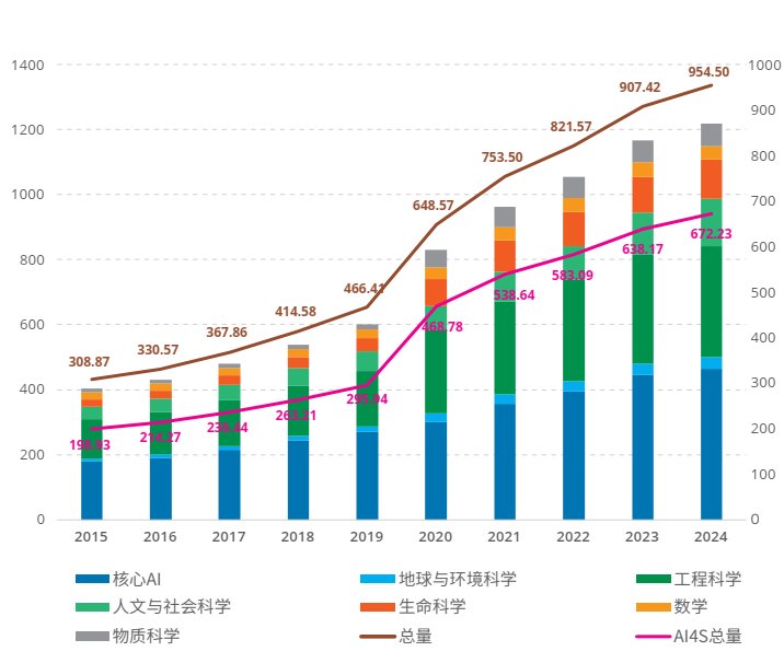 根据自然科研智讯提供的AI相关出版物数量、引用量以及自然指数(Nature Index) 等多源大数据统计显示,2015截截至2024年间,全球人工智能和科学智能领域的学术出版物总量快速增长,科学智能异军突起,2020年后加速成长,有力推动了人工智能研究整体的井喷态势。全球人工智能期刊论文数量在过去十年间激增近三倍——从30.89万篇增至95.45万篇,年均增长率为14%。人工智能核心领域(如算法、机器学习)占比从44%降至38%;科学智能占比相应提升了6个百分点,且其年均增长率从2020前的10%,提升至2020后的19%。尤其是在工程科学和生命科学领域,其年均增长率分别从2020年前的9%和15%,提升至2020年后的16%和29%。