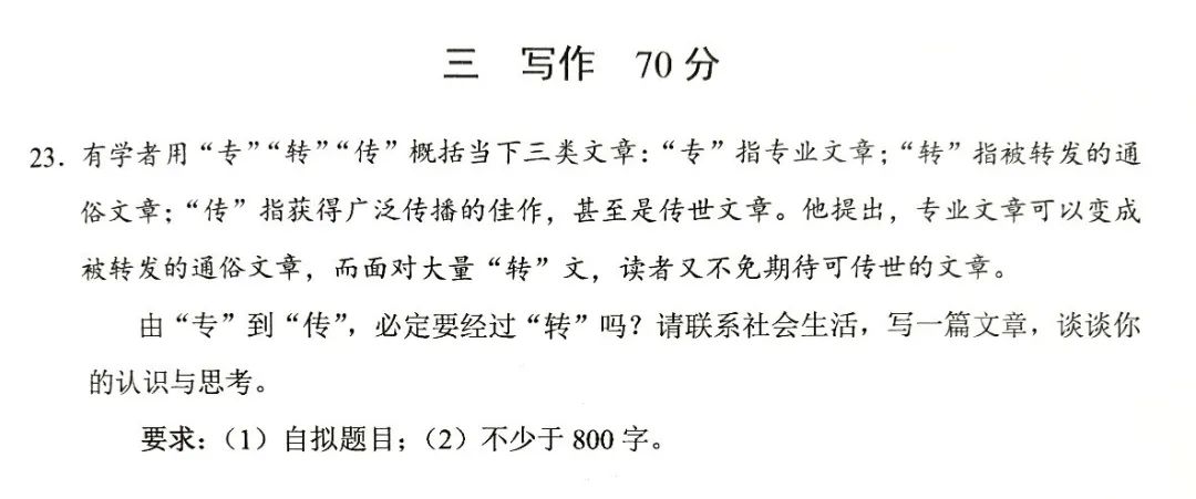 今年上海高考语文考试结束了,作文题目刚刚向社会公布。这是一篇半命题的材料作文,请你也按要求写一篇同题的高考作文。以下是题目要求——有学者用“专”“转”“传”概括当下三类文章:“专”指专业文章;“转”指被转发的通俗文章;“传”指获得广泛传播的佳作,甚至是传世文章。他提出,专业文章可以变成被转发的通俗文章,而面对大量“转”文,读者又不免期待可传世的文章。由“专”到“传”,必定要经过“转”吗?请联系社会生活,写一篇文章,谈谈你的认识与思考。要求:(1)自拟题目:(2)不少于800字