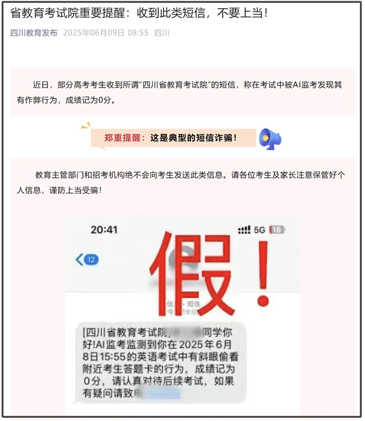 原标题:多地教育考试院郑重提醒:“被AI监考发现作弊”为诈骗短信 来源:中国教育在线