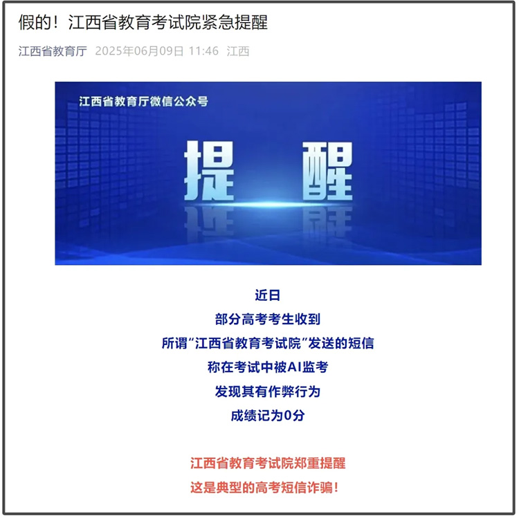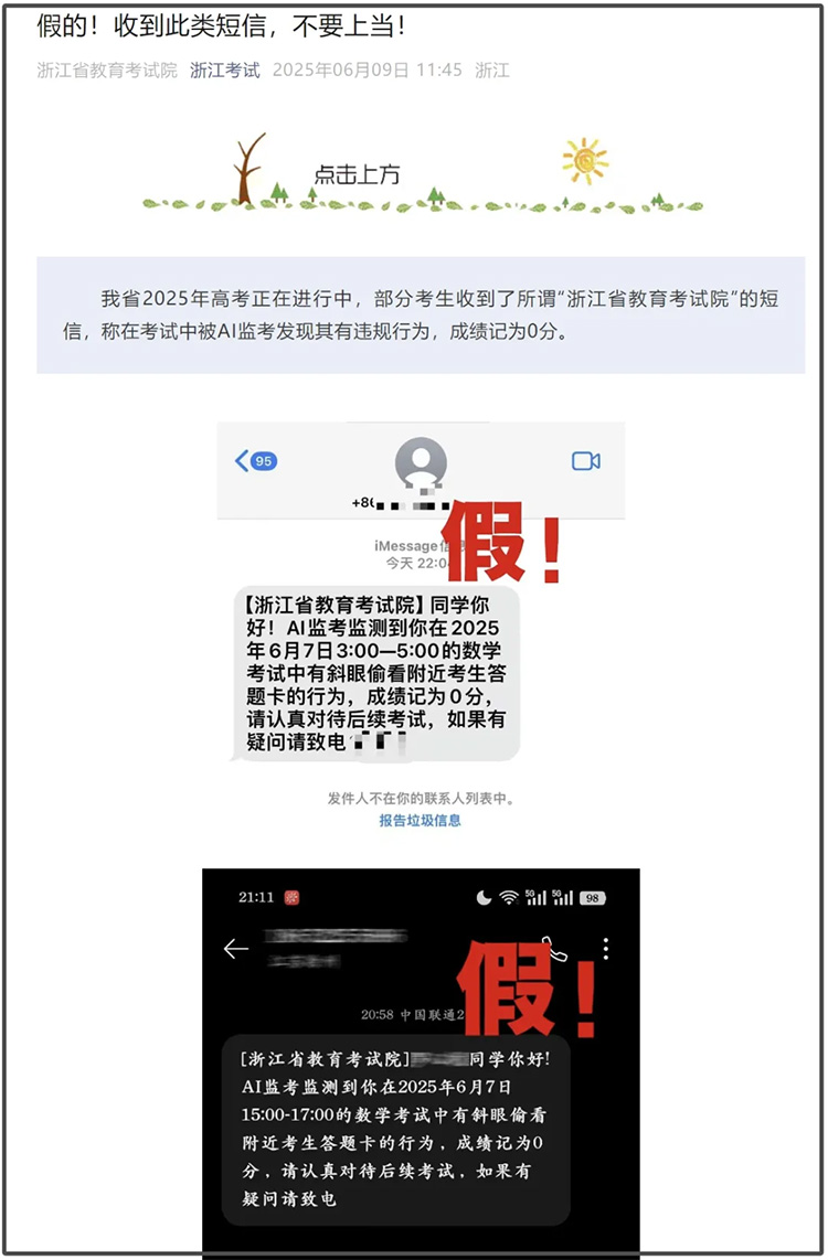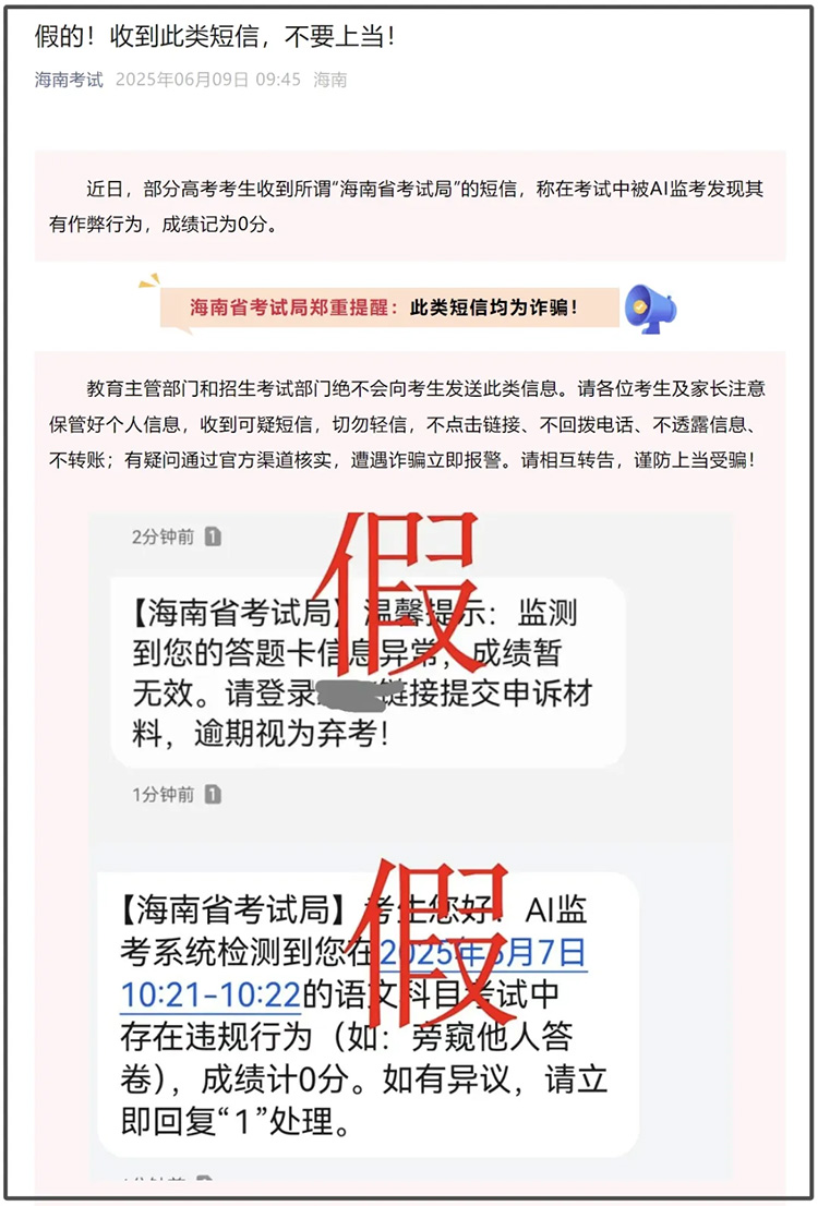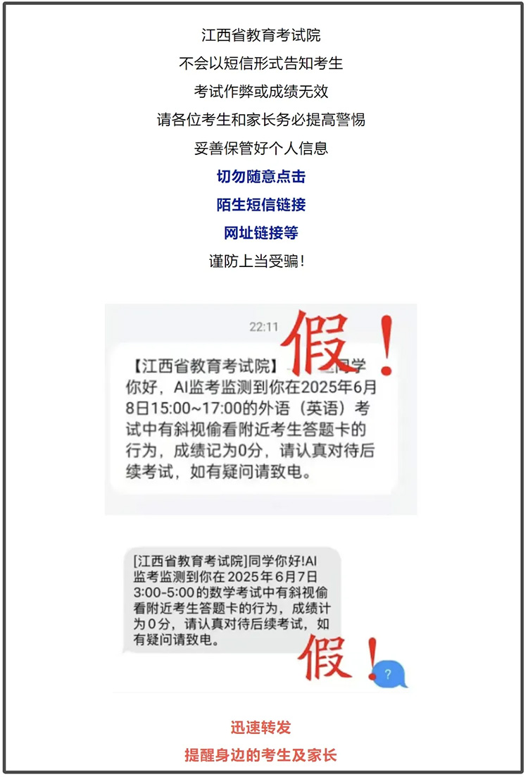 此前,教育部和各地考试院已多次预警,高考期间不法分子可能通过伪造短信、虚假链接等方式实施诈骗,例如谎称“作弊被抓”“提前查分”等,诱导考生点击钓鱼网站或支付“罚款”。若收到可疑短信,考生和家长可通过省教育考试院官网或拨打官方电话核实,切勿轻信短信。请各位考生及家长注意保管好个人信息,收到可疑短信,切勿轻信,不点击不明链接、不扫描不明二维码,不回拨电话、不透露信息、不转账;有疑问通过官方渠道核实;若遭遇诈骗,保留证据并立即拨打110或反诈专线96110报警。常见诈骗套路·伪造官方身份,诈骗分子冒充“省考试局”“教育招生办”等机构,通过伪基站发送短信,内容包含“AI作弊判定”“成绩作废”等威胁性表述,诱导考生点击链接或拨打“处理电话”。·技术伪装升级,部分诈骗结合AI合成技术,伪造官方文件、公章甚至语音通话,进一步骗取信任。·勒索或信息窃取,直接索财:要求支付“罚款”或“保证金”以“撤销处罚”。·钓鱼链接,点击后跳转虚假网站,窃取准考证号、银行卡信息等。·“内部指标”诈骗,谎称可通过“关系”补录或改分,要求支付“手续费”。高考录取全程公开透明,不存在任何“内部操作”。伪造录取通知书,考后警惕“野鸡大学”或虚假录取通知,务必通过教育部学信网或高校官网核实。最后,再次提醒大家,高考是人生重要节点,切勿因一时慌乱落入骗局。请广大考生和家长以官方渠道为准,保持冷静,共同维护高考的公平公正。教育部以及各省(区、市)2025年的高考举报电话