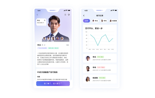 科技行业:万人级IT软件龙头,通过AI陪练模拟大客户销售场景,AI 教练辅导通关,一周内平均完成4次训练,全员通关,销售技能深度沉淀,高成本线下教练资源转化为可复用的数字训练资产,节省成本数十万新员工独立开展业务能力显著提升。