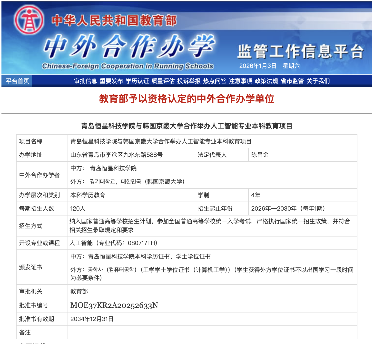 近日,教育部公布中外合作办学项目审批结果,青岛恒星科技学院与韩国京畿大学合作举办的人工智能专业本科教育项目成功获批。这是我校首个获教育部批准的中外合作办学项目,标志着学校在引进优质国际教育资源、推进人才培养国际化方面迈出了重要一步。