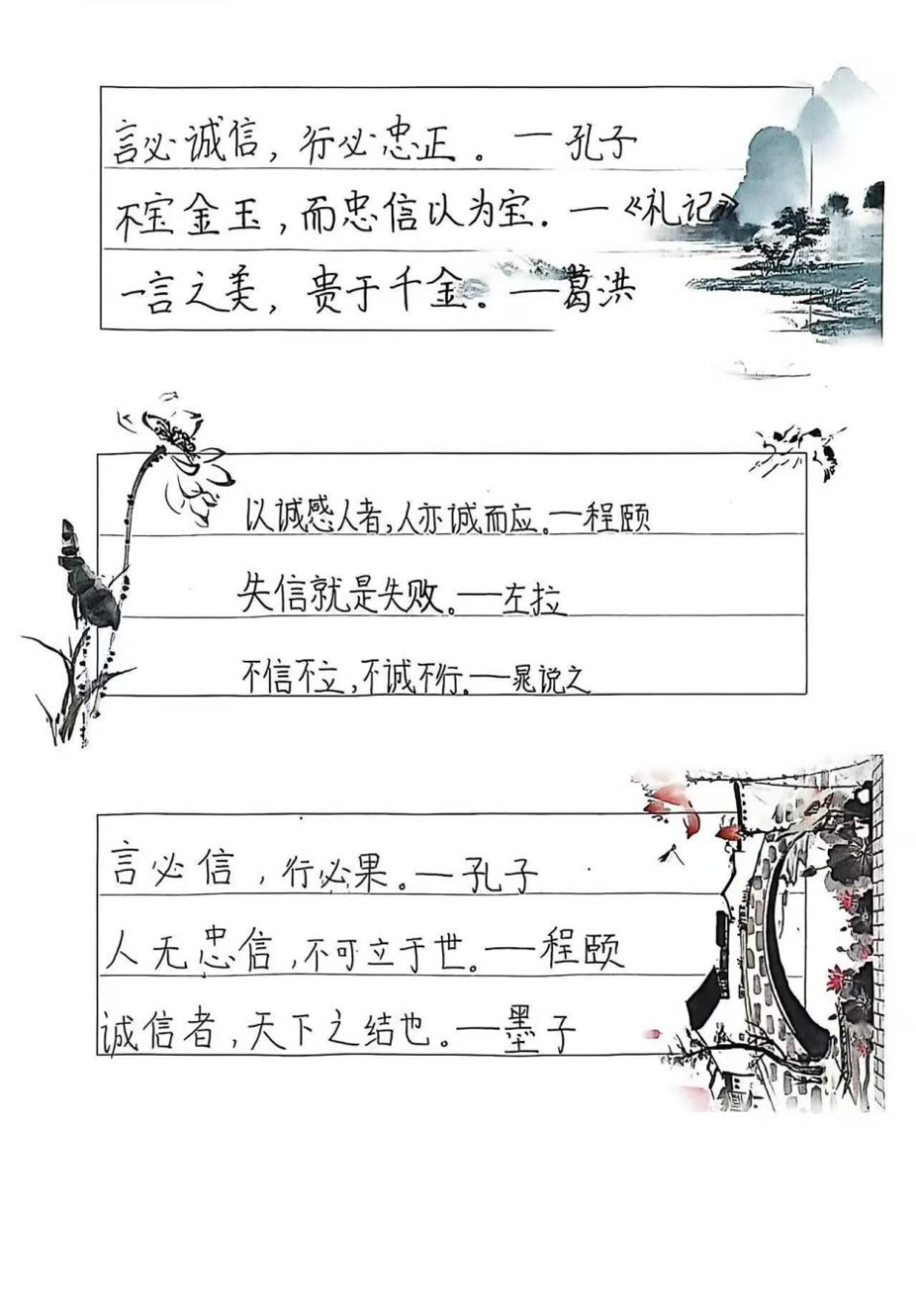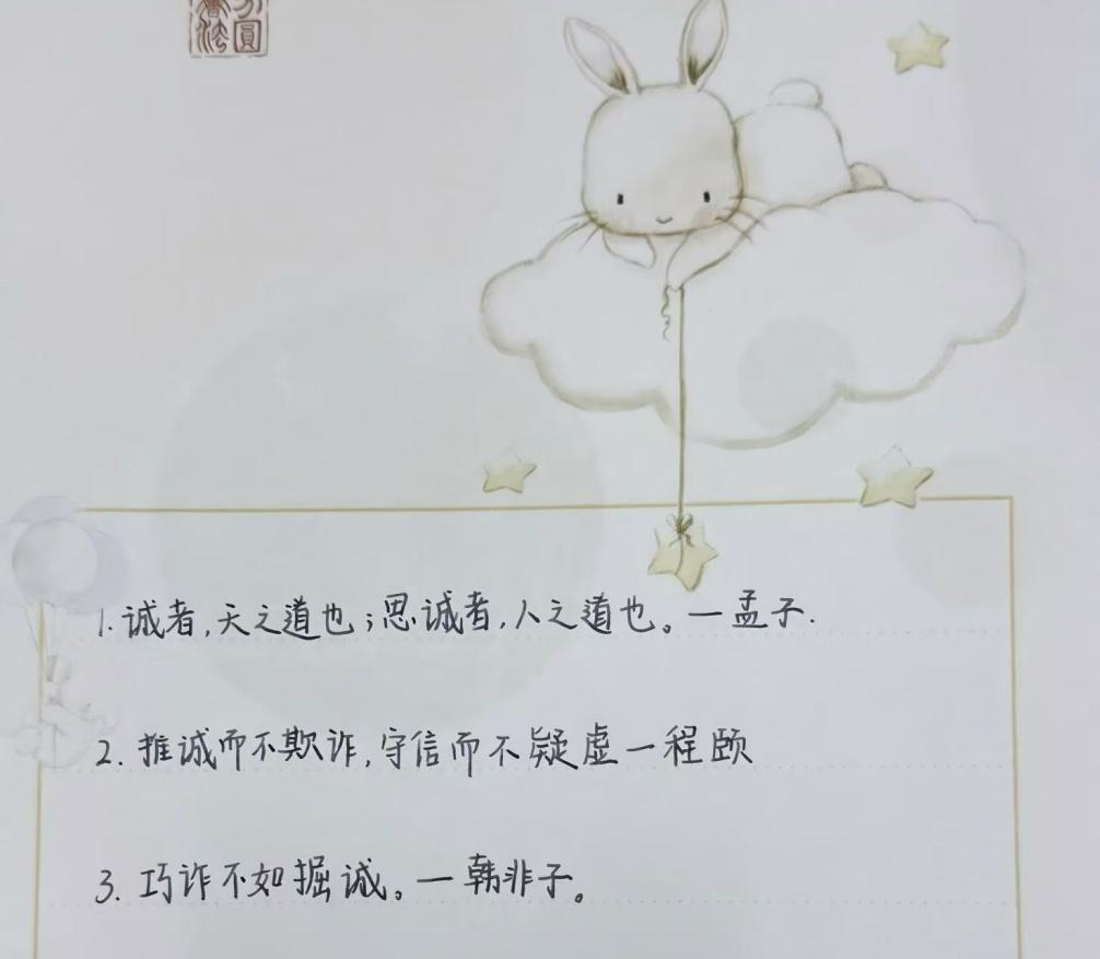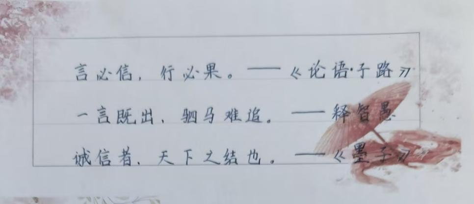 孩子们拿起纸笔,认真摘抄"言必信,行必果""人而无信,不知其可也"等经典诚信格言。一笔一画的书写中,墨香伴着哲理流淌,这些凝聚着先贤智慧的话语,不仅被记在笔记本上,更印刻在孩子们的心里。他们纷纷表示,要以格言为行为标尺,做言出必行的诚信少年。
