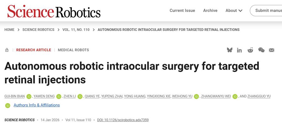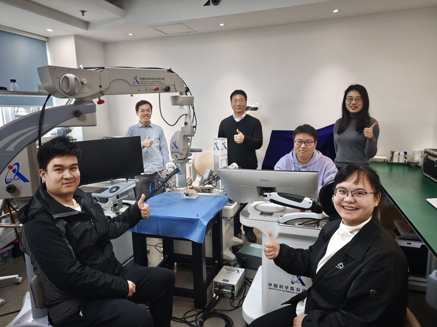 机器人自主完成视网膜下和血管内注射,不仅100%注射成功,而且平均定位误差还比医生分别减少了79.87%和54.61%?这就是中国科学院自动化研究所多模态人工智能系统全国重点实验室边桂彬研究员课题组成功研发出的一款自主显微眼科手术机器人系统。如今,该系统的临床可行性已获验证——在整个眼内空间可实现自主的视网膜下和血管内注射,可显著提高眼底注射的精确性、安全性和一致性,最大限度地减少医源性损伤,可辅助外科医生更加专注于手术设计和监督任务。相关成果近日发表于《科学•机器人》(Science Robotics)。
